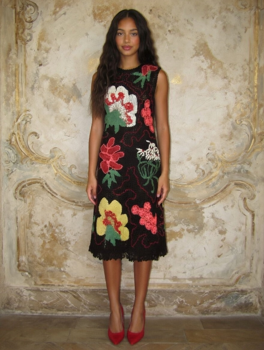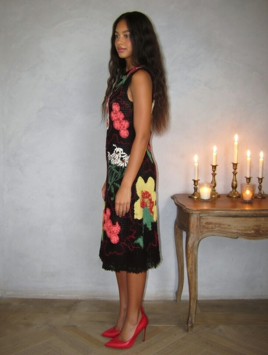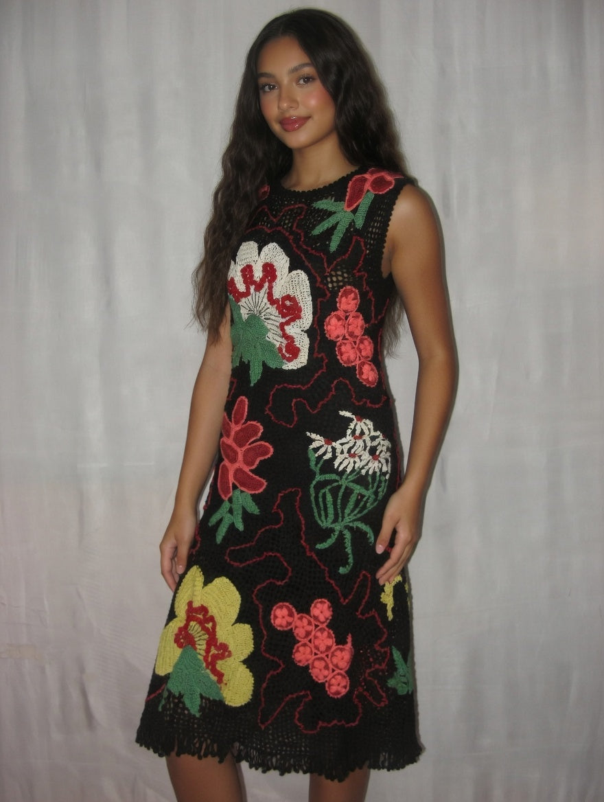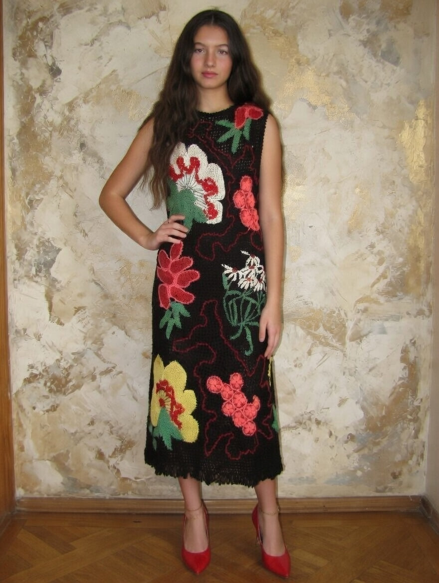 Each flower and decorative element is crocheted separately and then joined together by hand, making every dress a true piece of textile art. Because of the handmade technique, it is impossible to reproduce this dress 100% identically, which means every piece is truly one-of-a-kind.