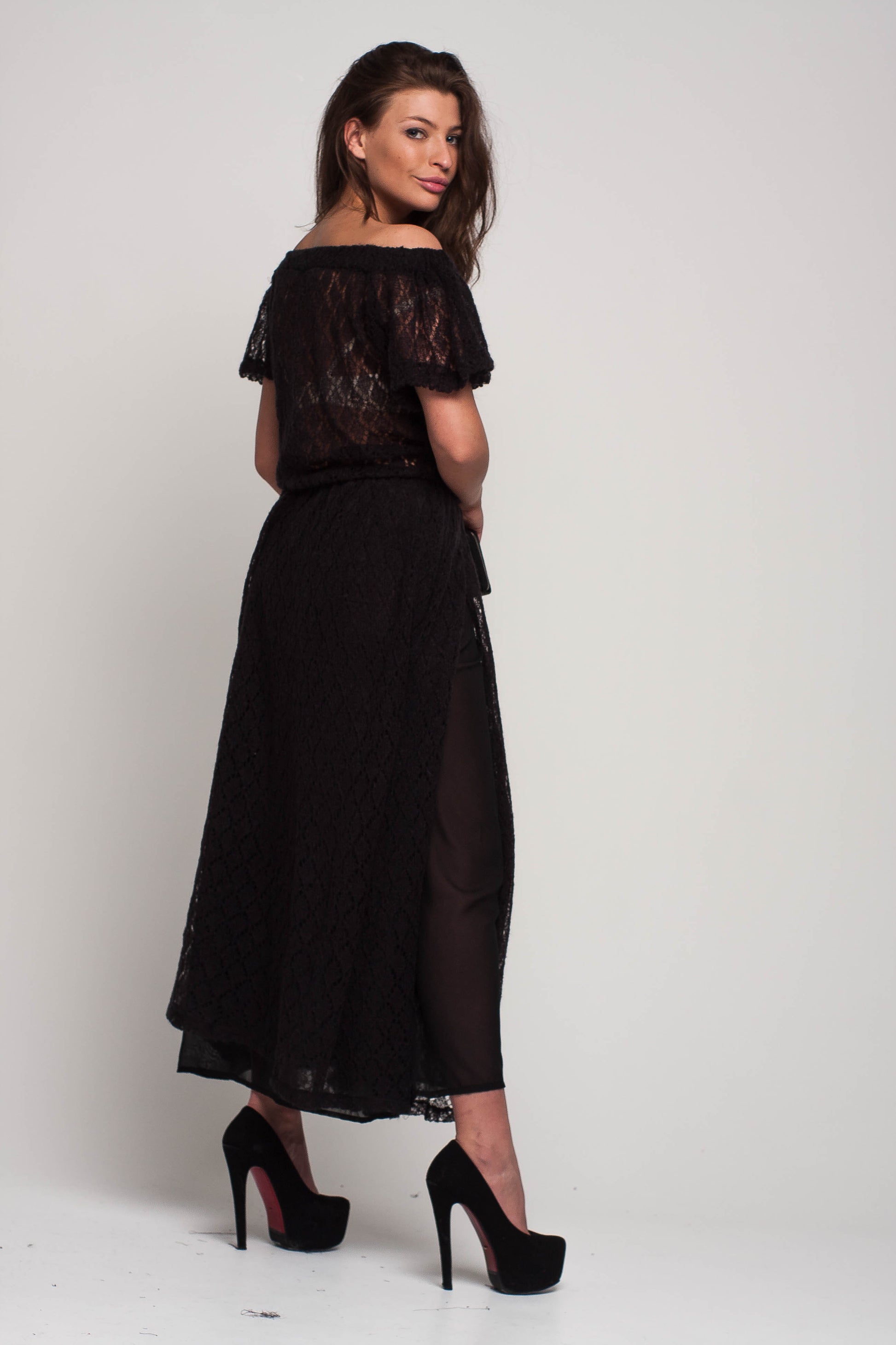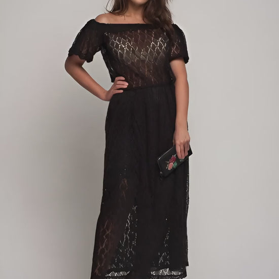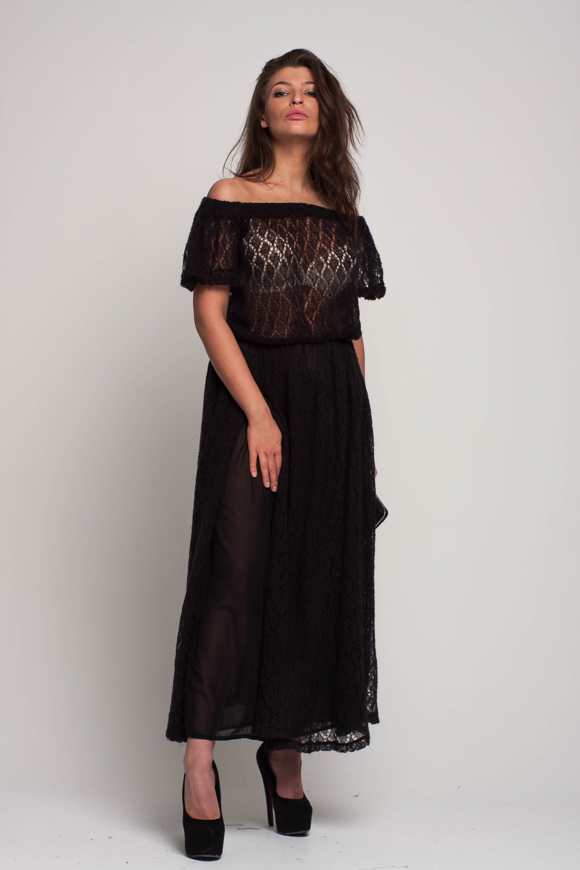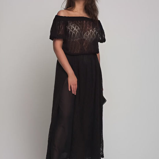 Black Off Shoulder Lacy Maxi Knit Mohair Dress with Slit and Pockets