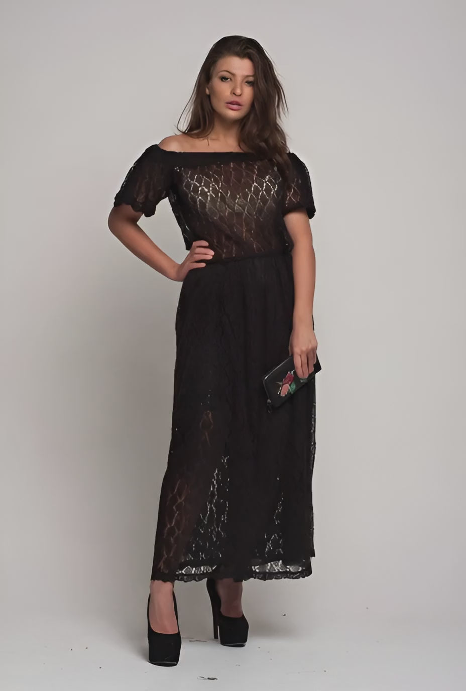 This black off shoulder maxi dress is a striking handmade crochet knit design created to emphasize elegance and individuality.