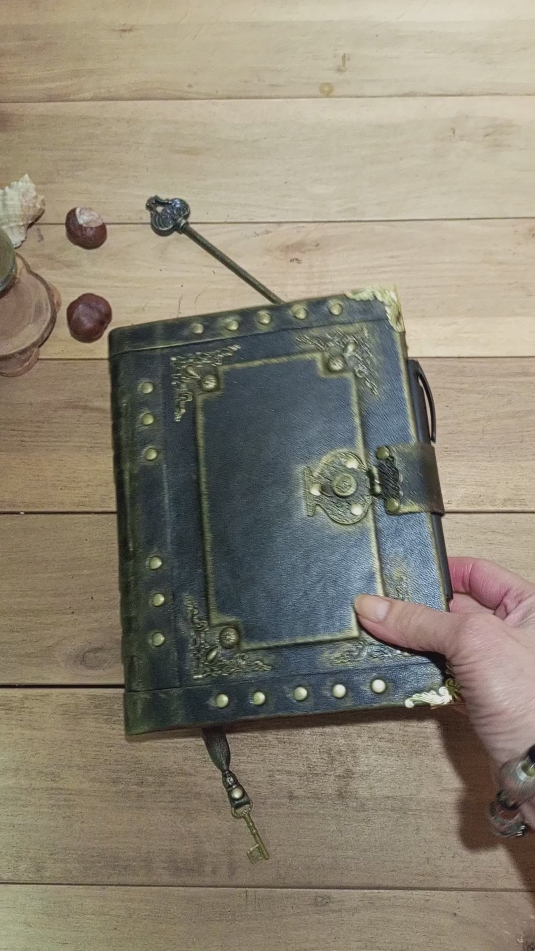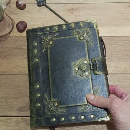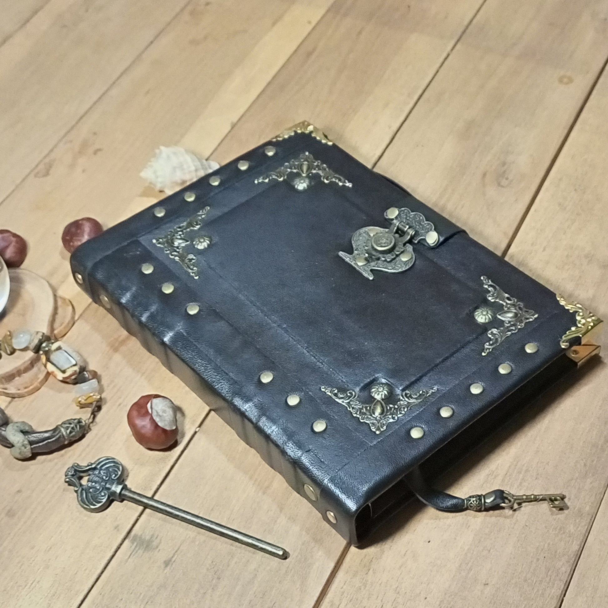 The leather cover is decorated with metal embellishments and secured with an antique-style lock, giving the notebook a beautiful vintage and medieval aesthetic.