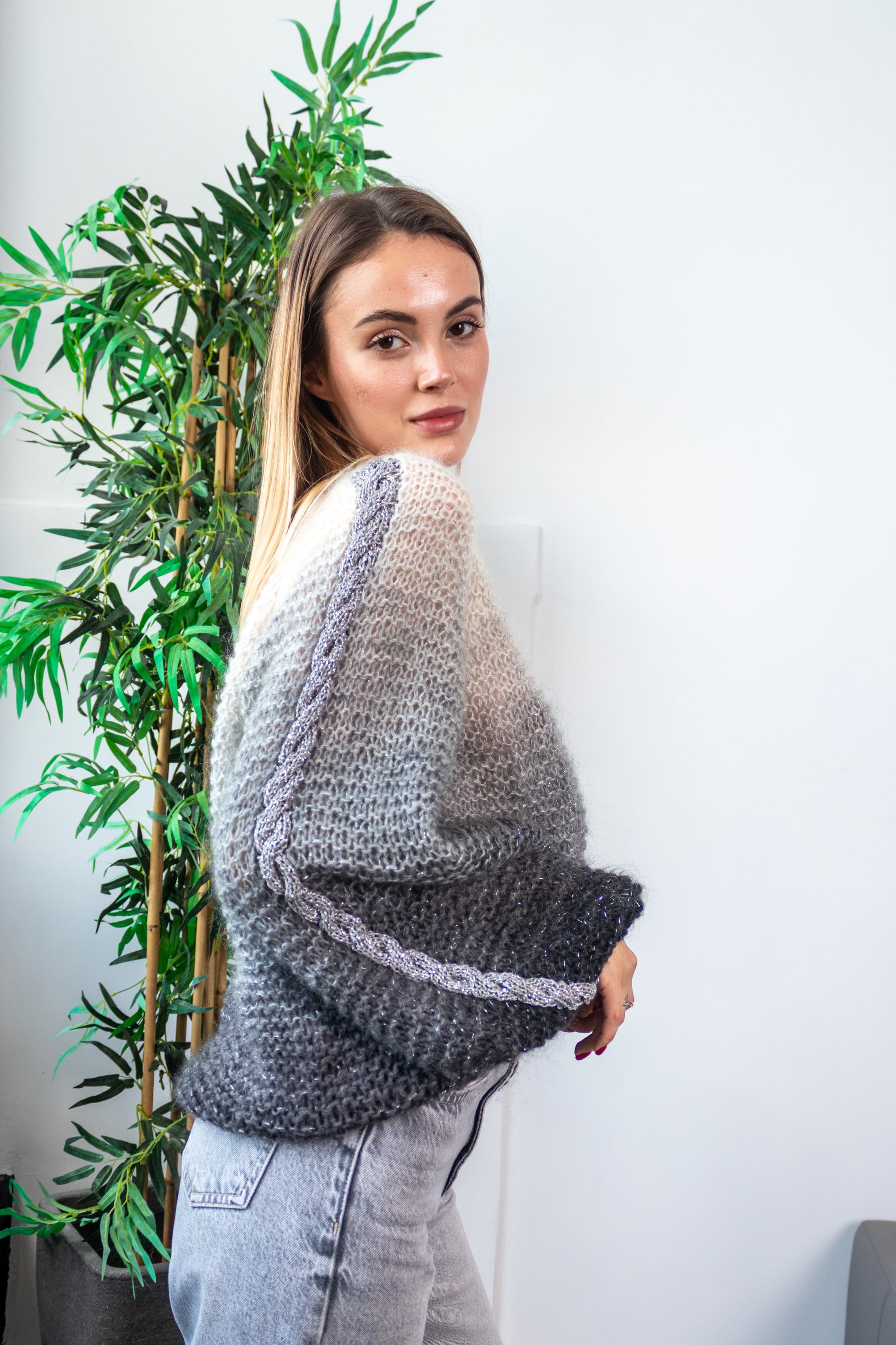 This handmade oversized mohair sweater in a black & white gradient is the perfect blend of comfort, warmth, and modern style. Carefully hand-knitted, it features a fluffy texture, relaxed silhouette, and elegant crew neckline.
