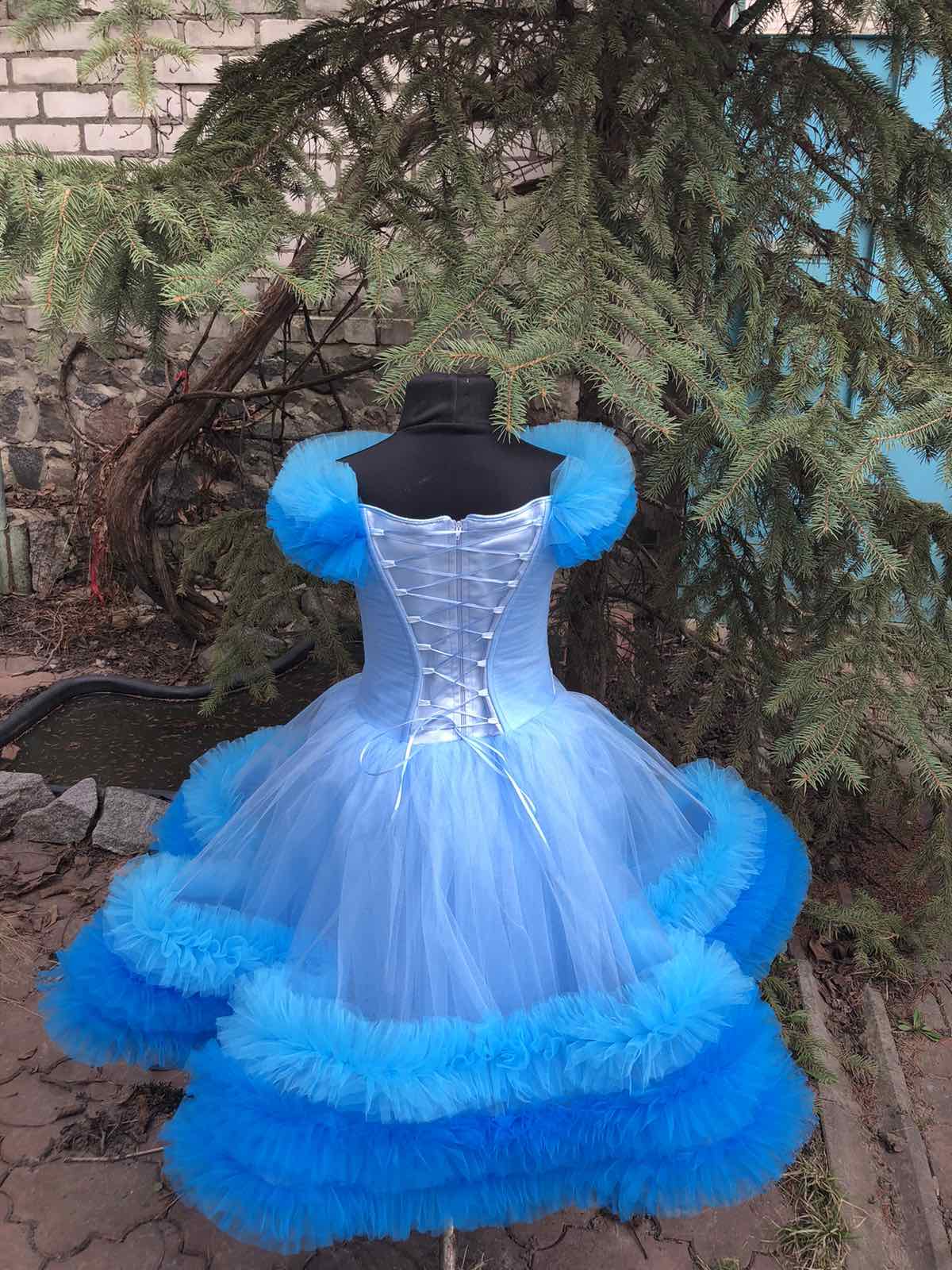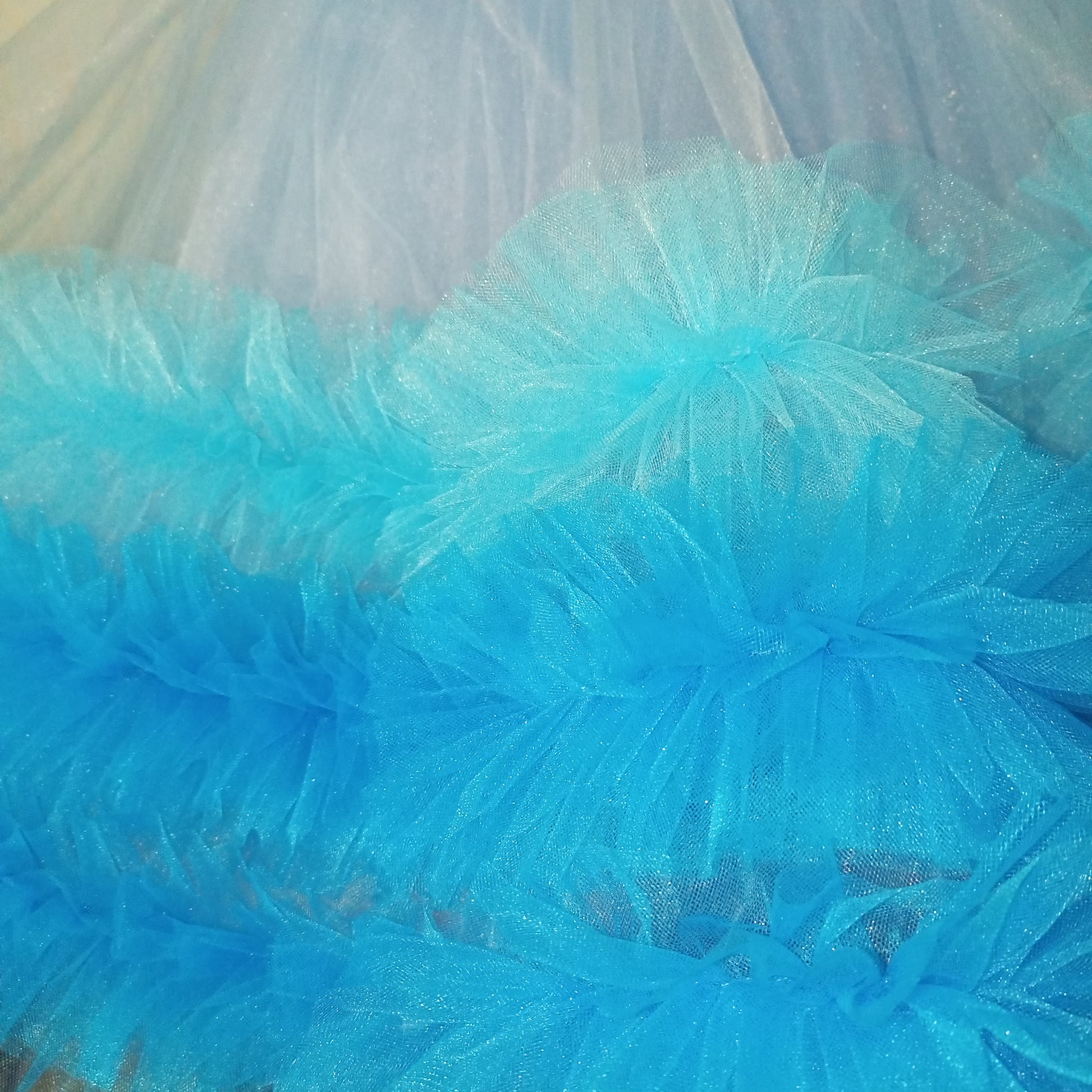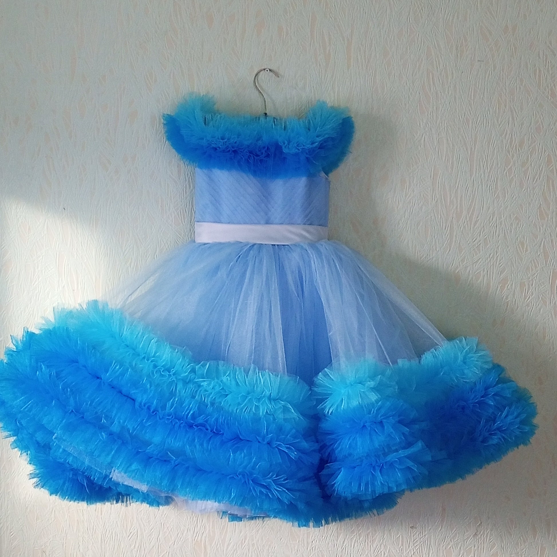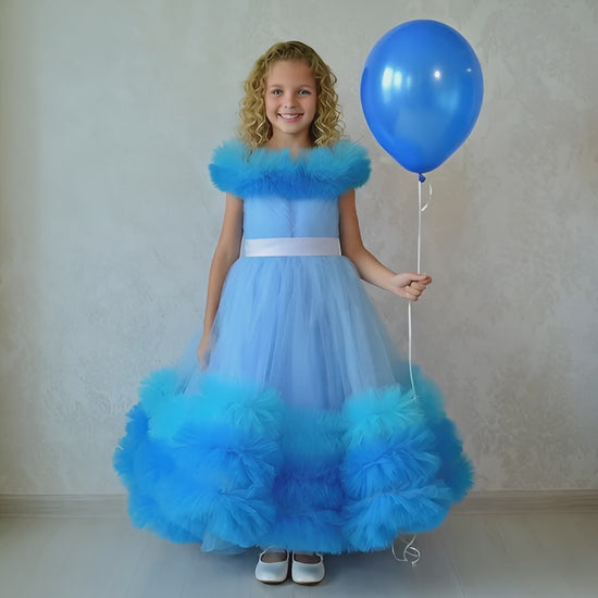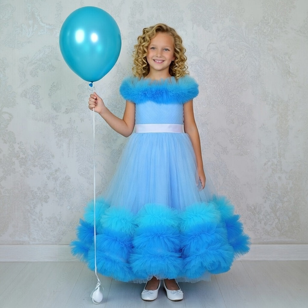 This stunning blue ball gown for girls is designed to make every little princess feel special. The elegant dress features a voluminous layered skirt made of soft tulle and structured mesh, creating a dramatic and airy silhouette perfect for celebrations.