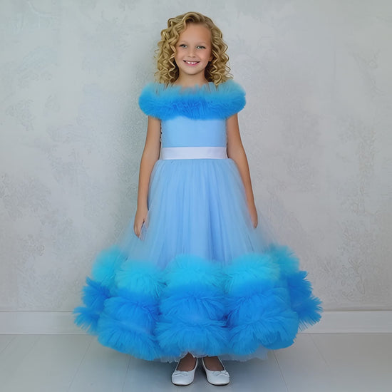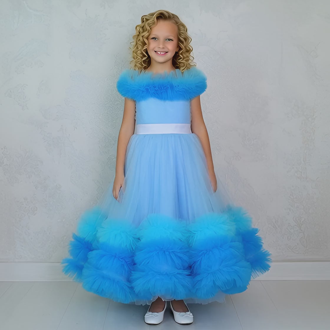 Blue Tulle Flower Girl Dress – Princess Ball Gown for Girls, Off Shoulder Party Dress