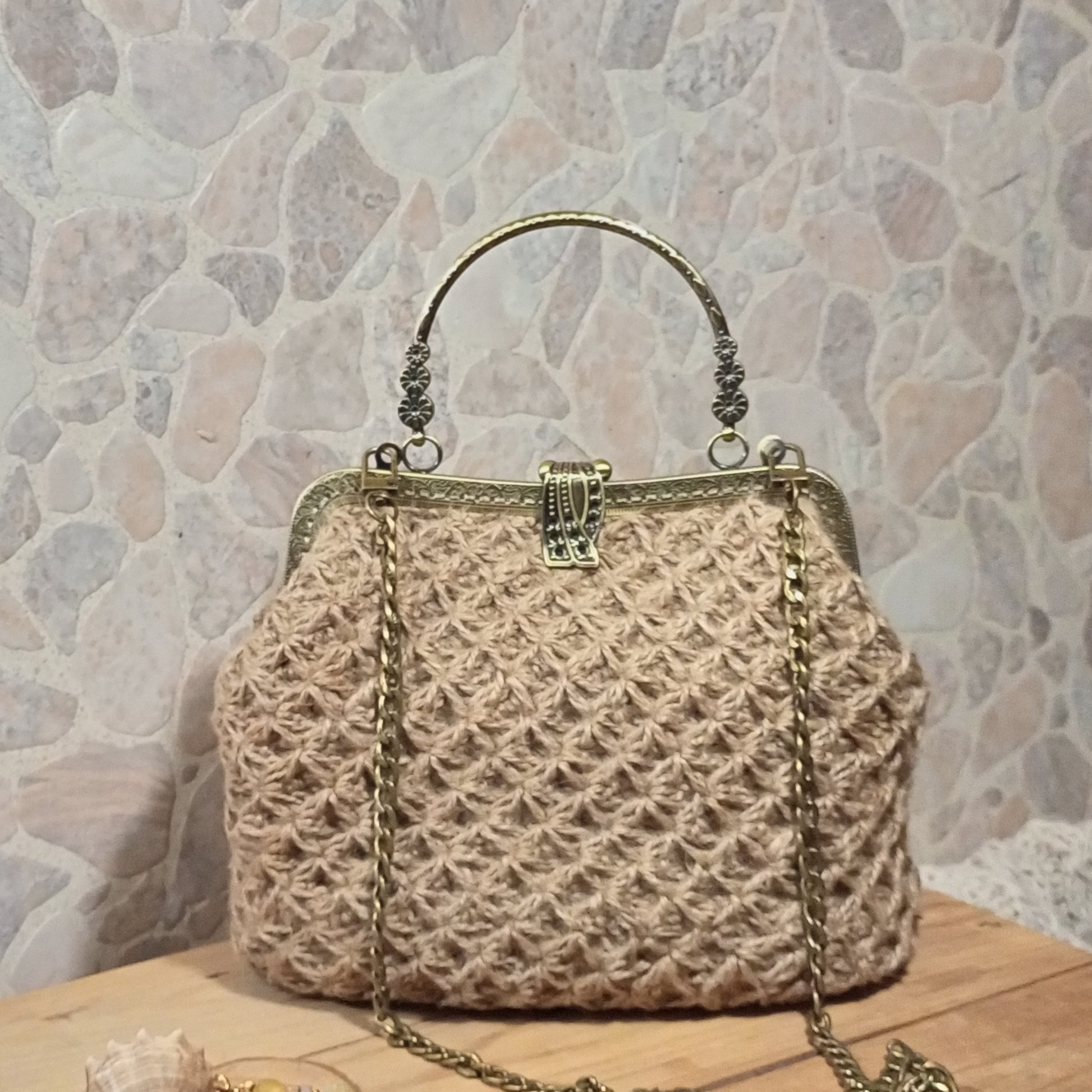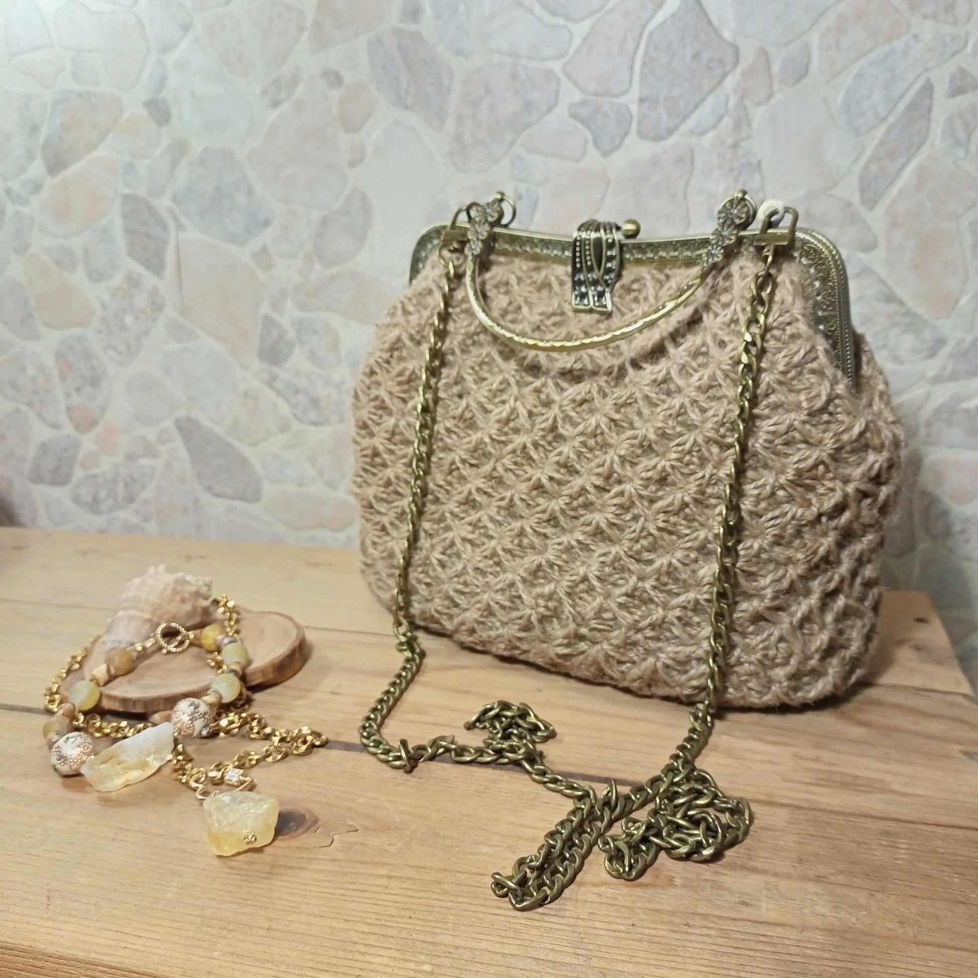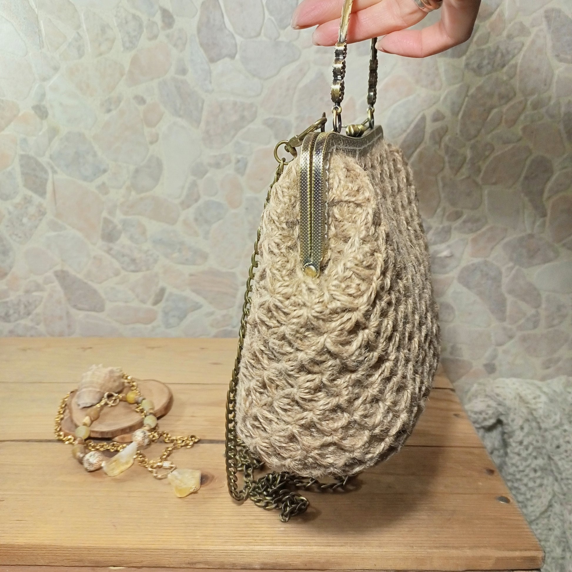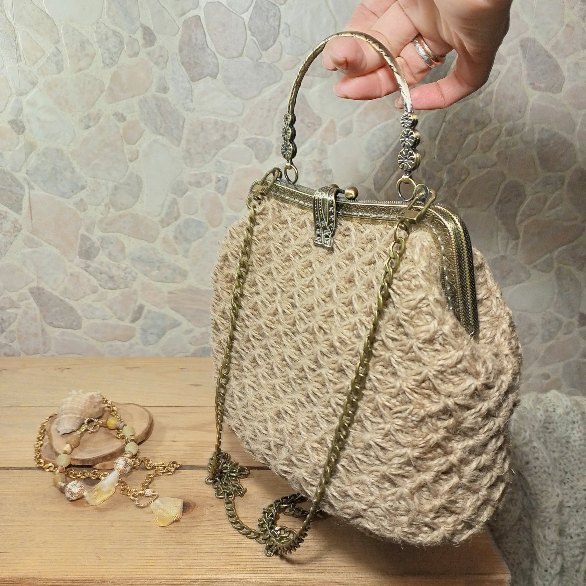 Add a natural boho accent to your outfit with this handmade beige crochet handbag crafted from 100% natural jute twine. Featuring a classic brass-tone metal kisslock frame and a removable chain strap, this bag combines eco-friendly materials with timeless vintage-inspired design.