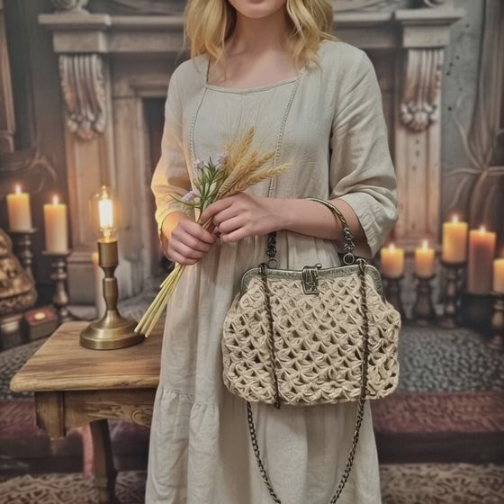 Bohemian Beige Crochet Jute Kisslock Bag – Handmade Natural Fiber Handbag with Chain Strap