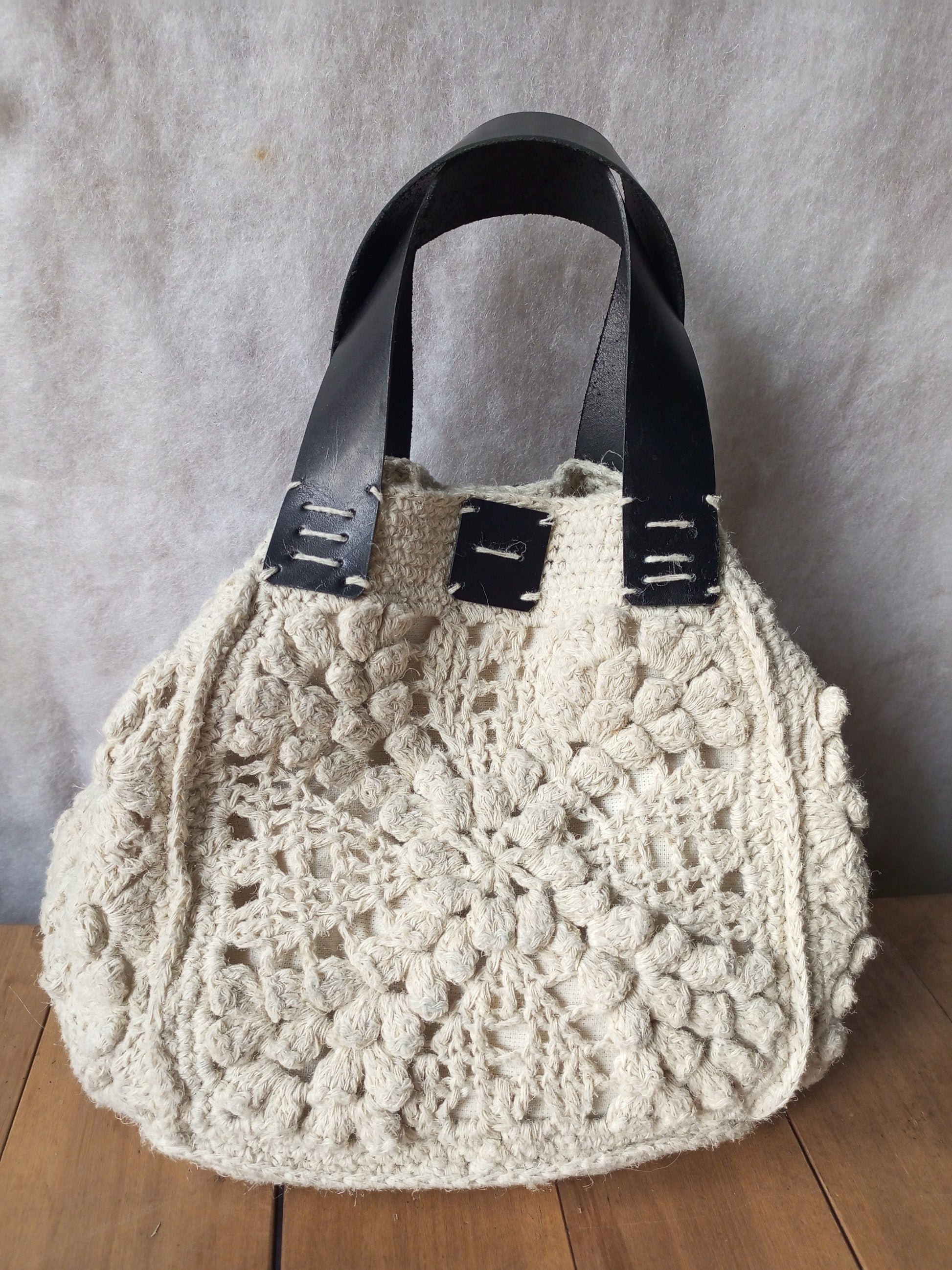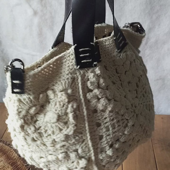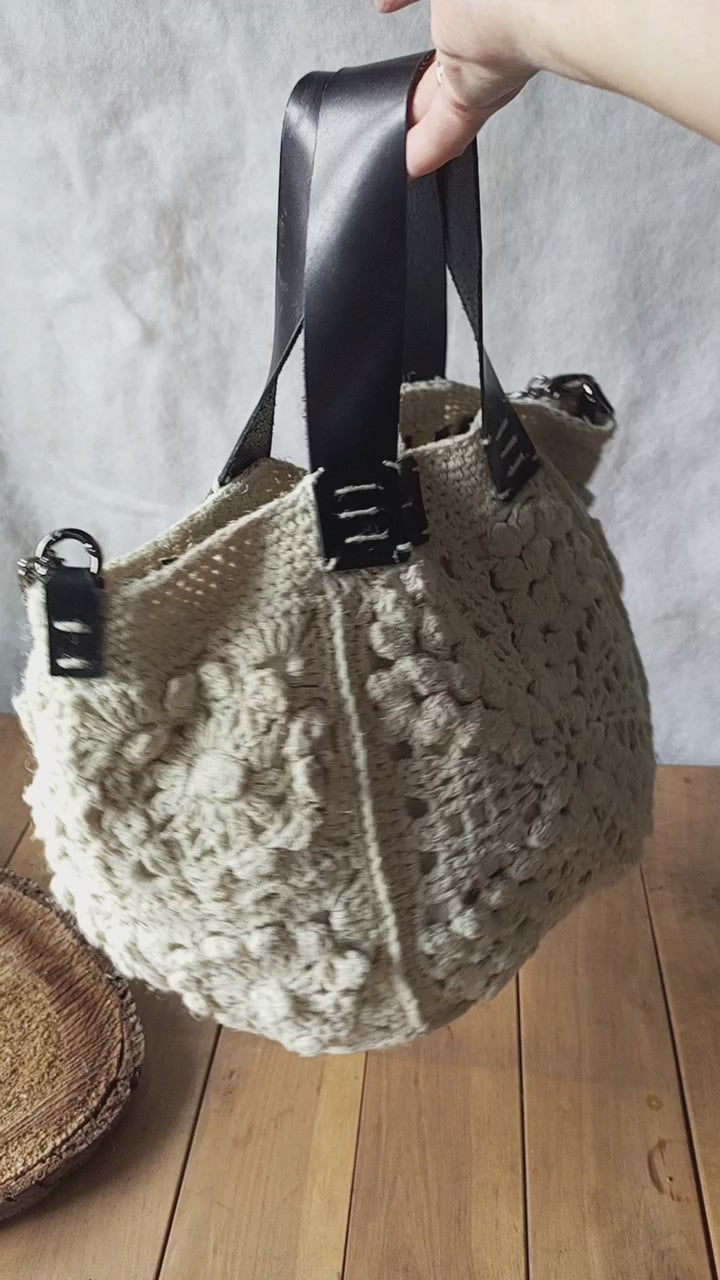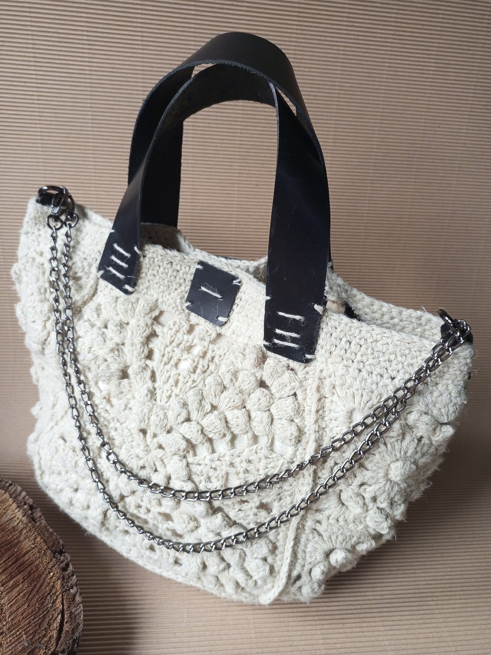 Bohemian Ivory Crochet Hemp Bag – Handmade Jute Handbag with Leather Handles and Chain Strap