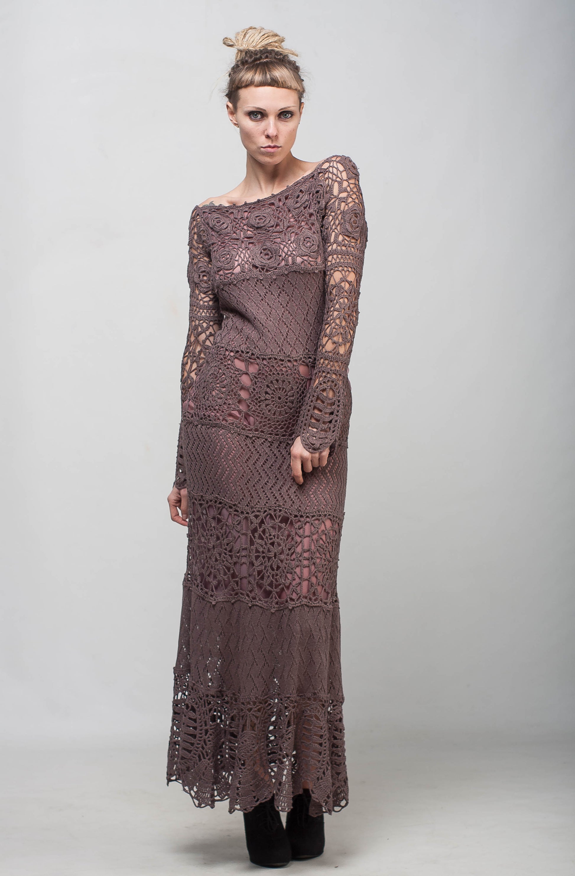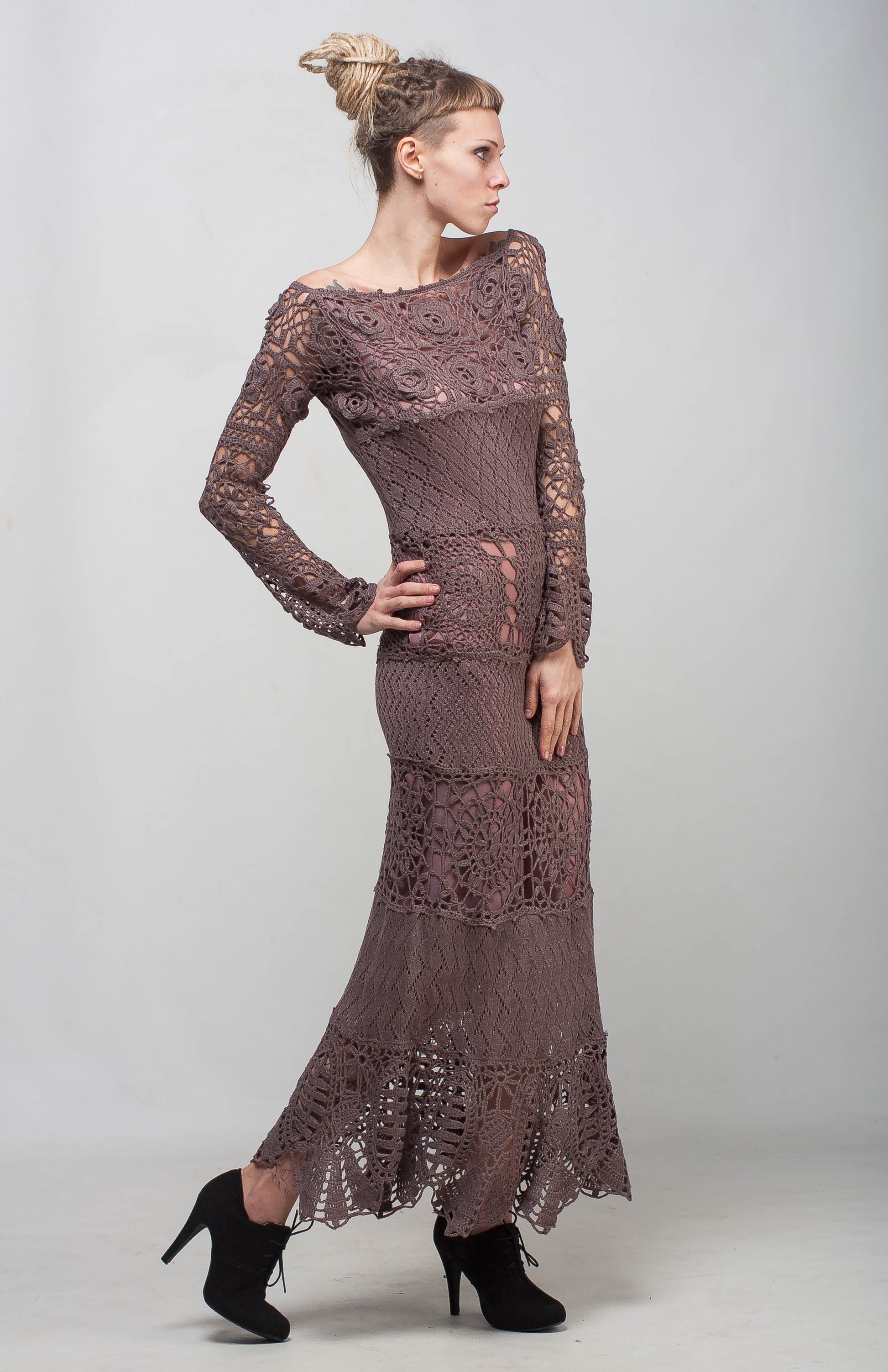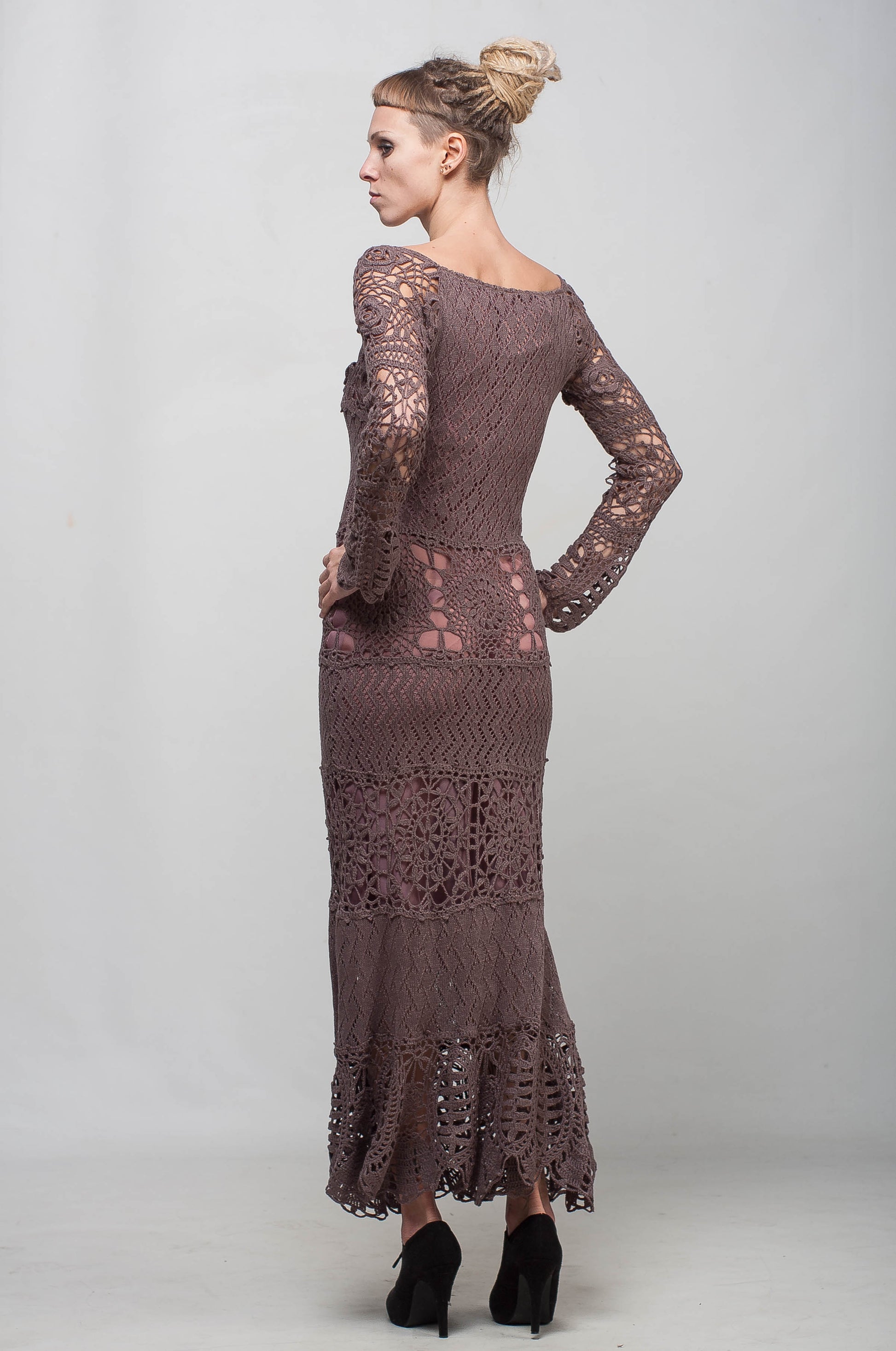 This tremendous crochet maxi lace dress with long sleeves is an original, one-of-a-kind handmade design. Carefully crocheted from soft viscose yarn, this mocha floor-length dress highlights femininity, elegance, and timeless style.