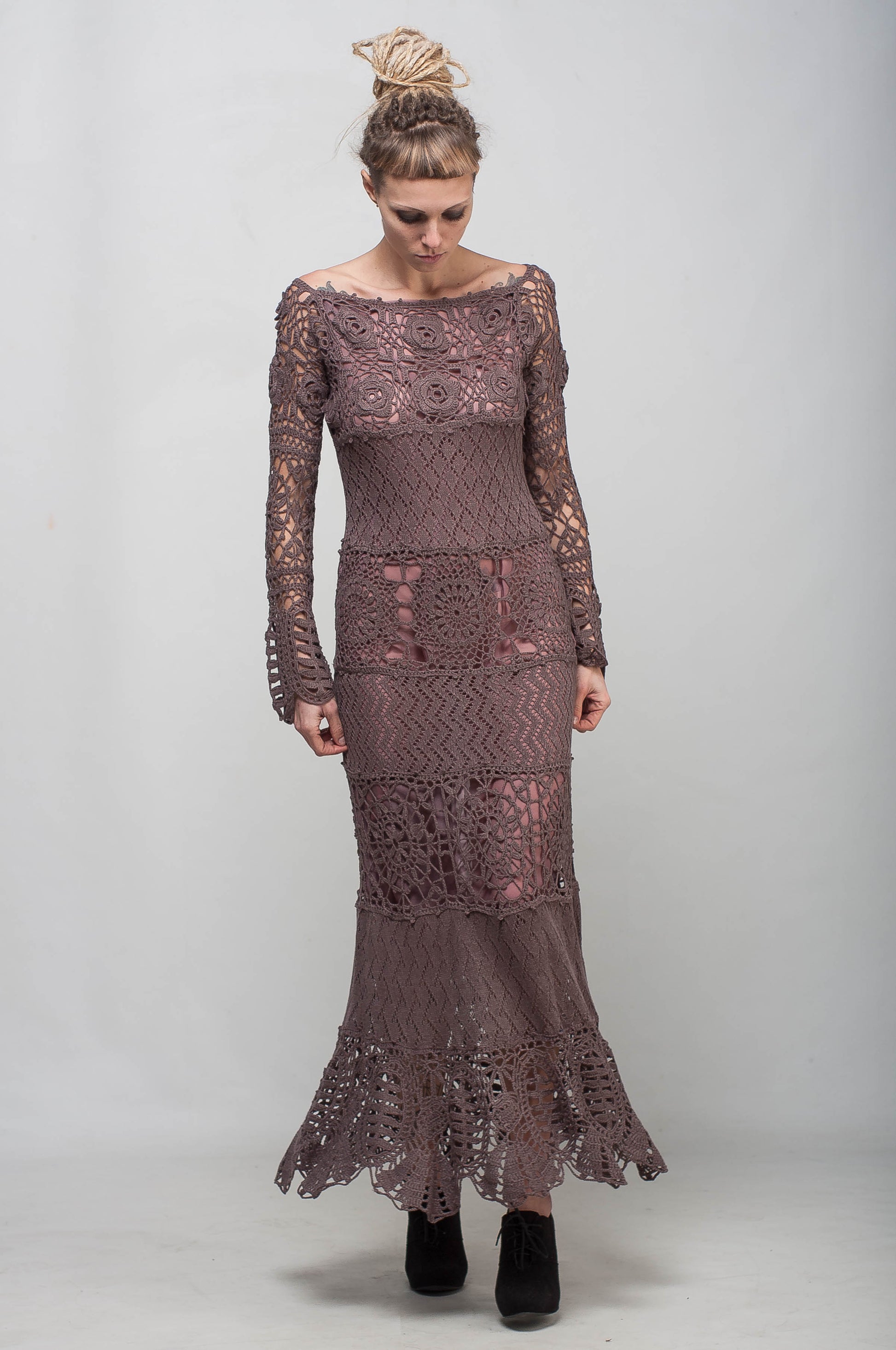 Crochet Maxi Lace Dress with Long Sleeves – Mocha Viscose Floor Length Handmade Dress