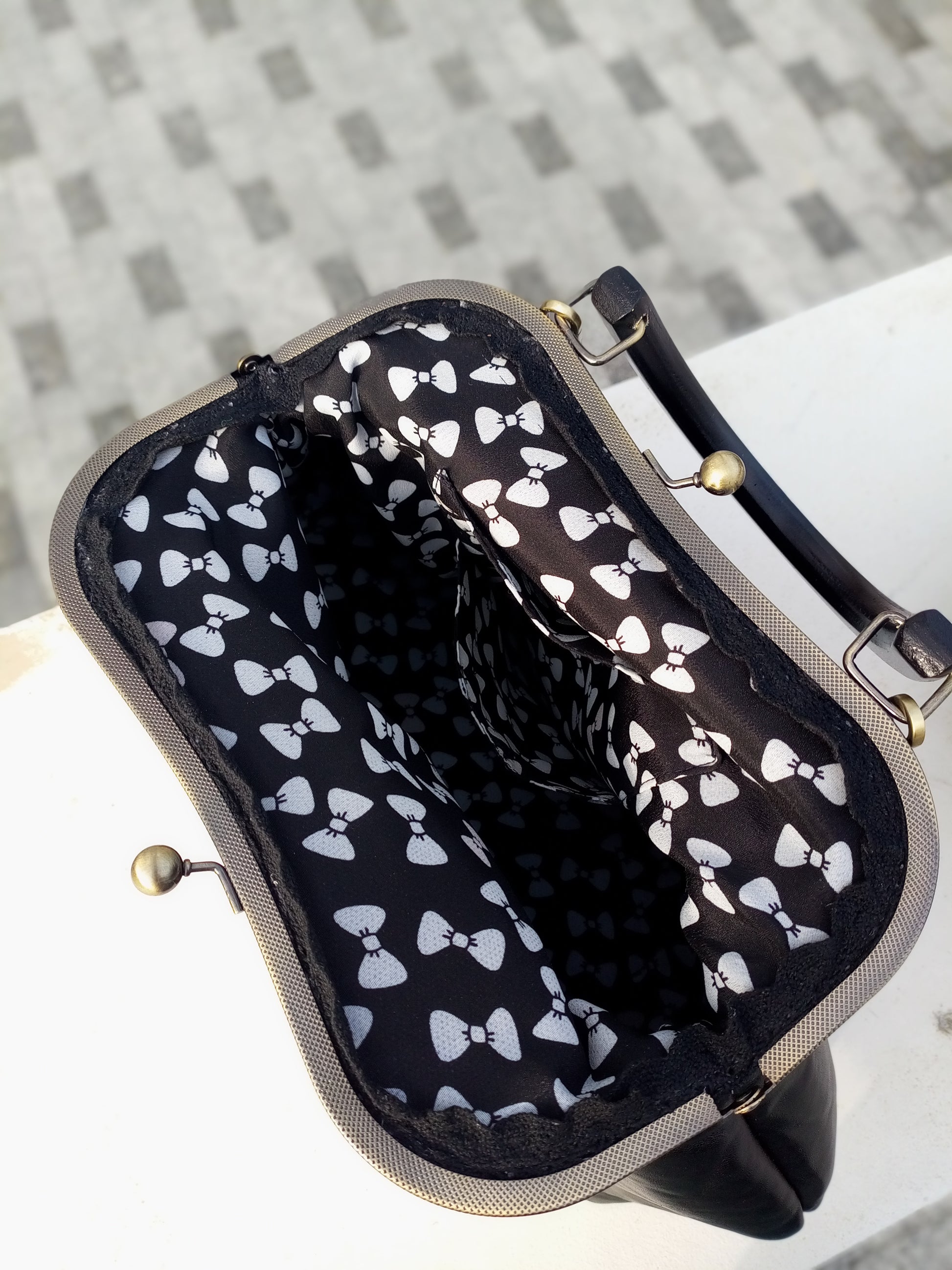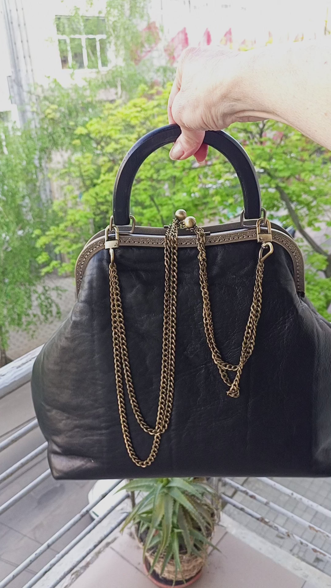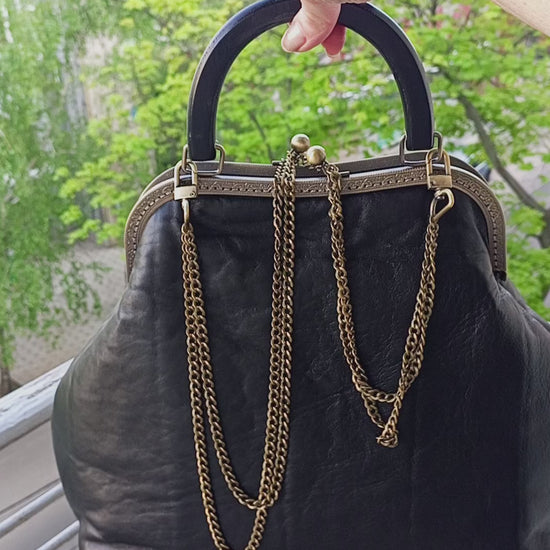 Handmade Black Leather Kisslock Bag – Vintage Clasp Frame Handbag with Chain Strap