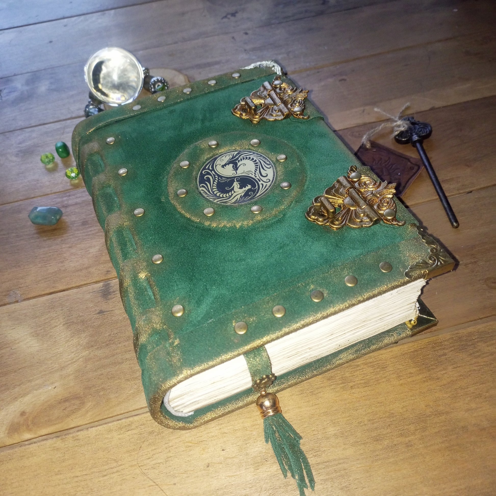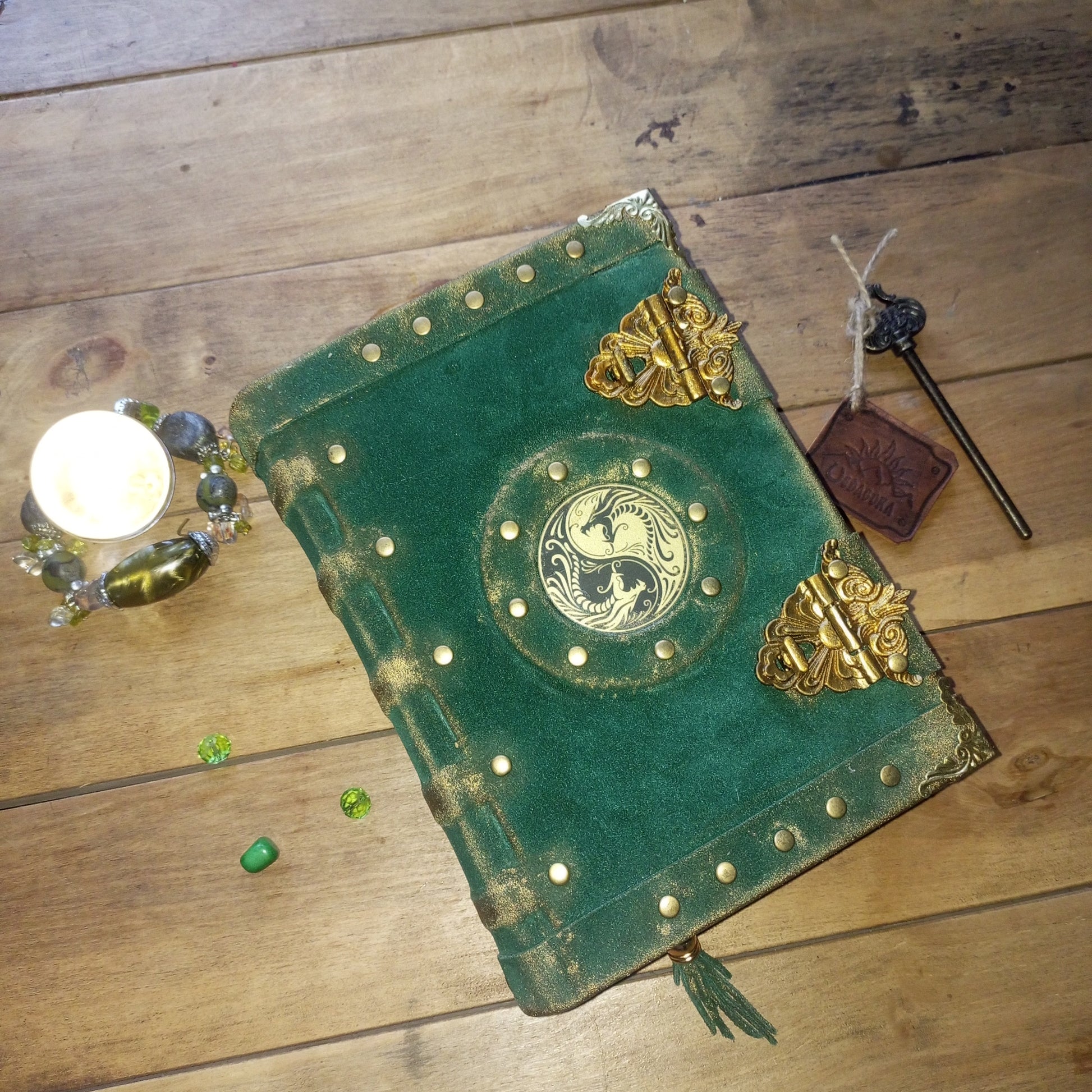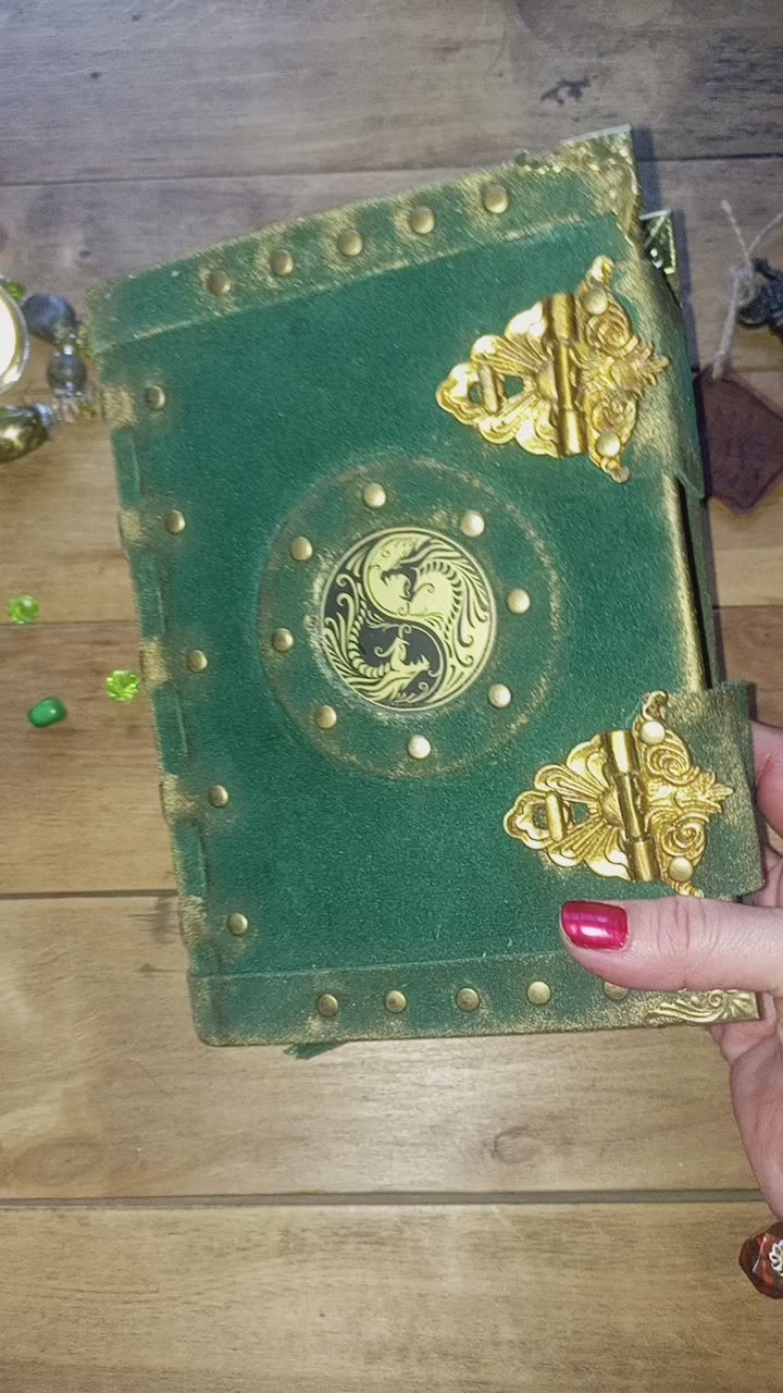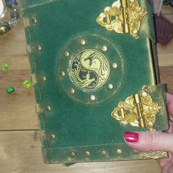 Handmade Green Suede Leather Journal with Yin Yang Symbol – Vintage Aged Notebook Leather Grimoire
