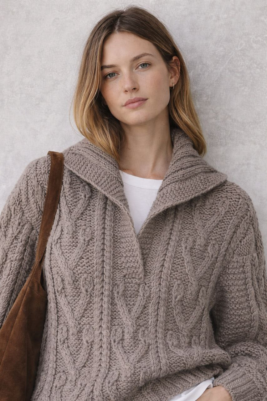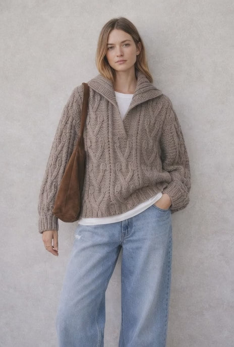 Stay cozy and fashionable with this oversized taupe knitted sweater featuring a stylish polo collar neckline. The classic cable knit texture combined with a relaxed silhouette creates a modern yet timeless look.