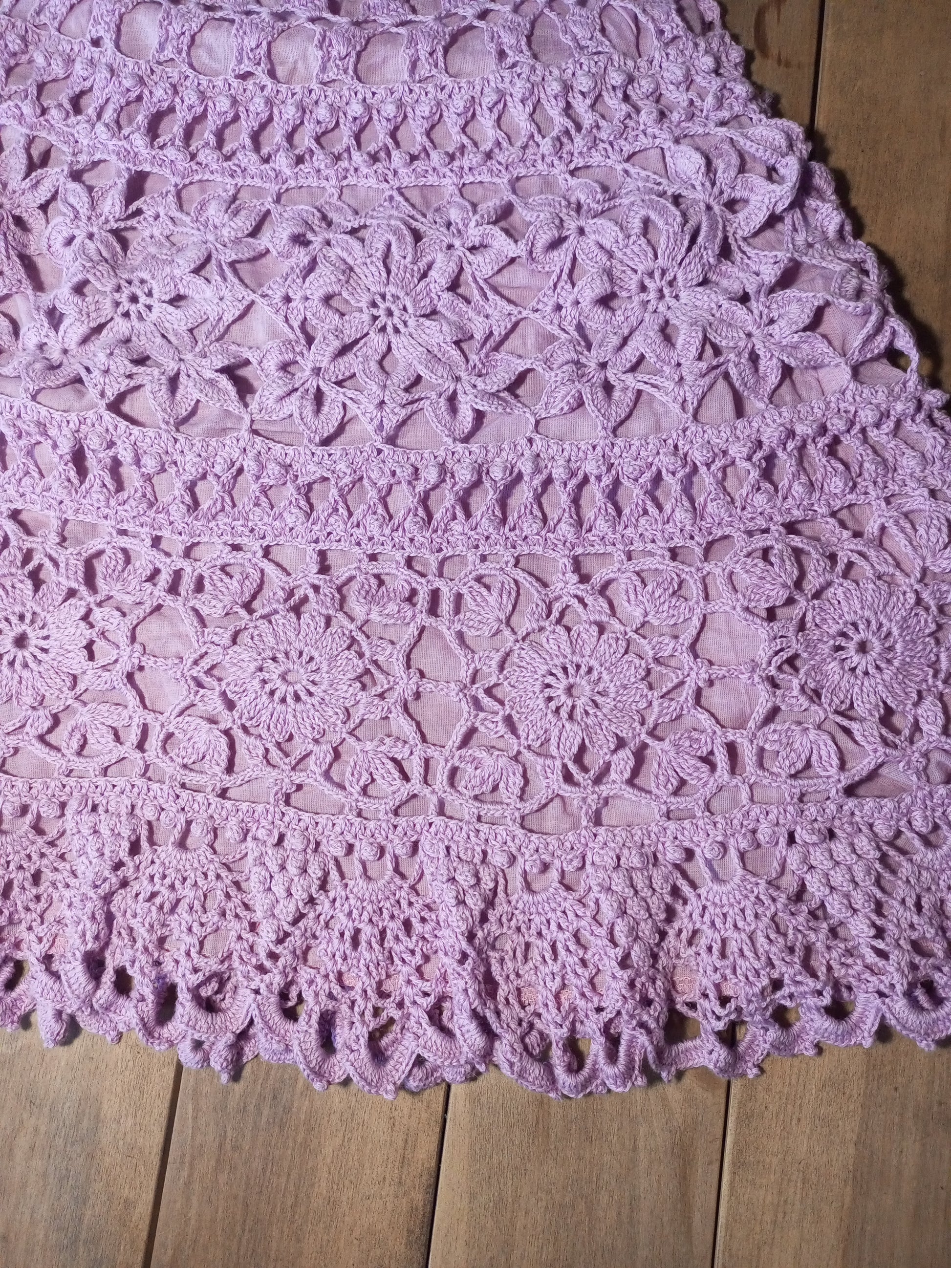The lightweight structure makes it ideal for warm seasons, while the artistic crochet pattern gives it a timeless, heirloom-quality look.