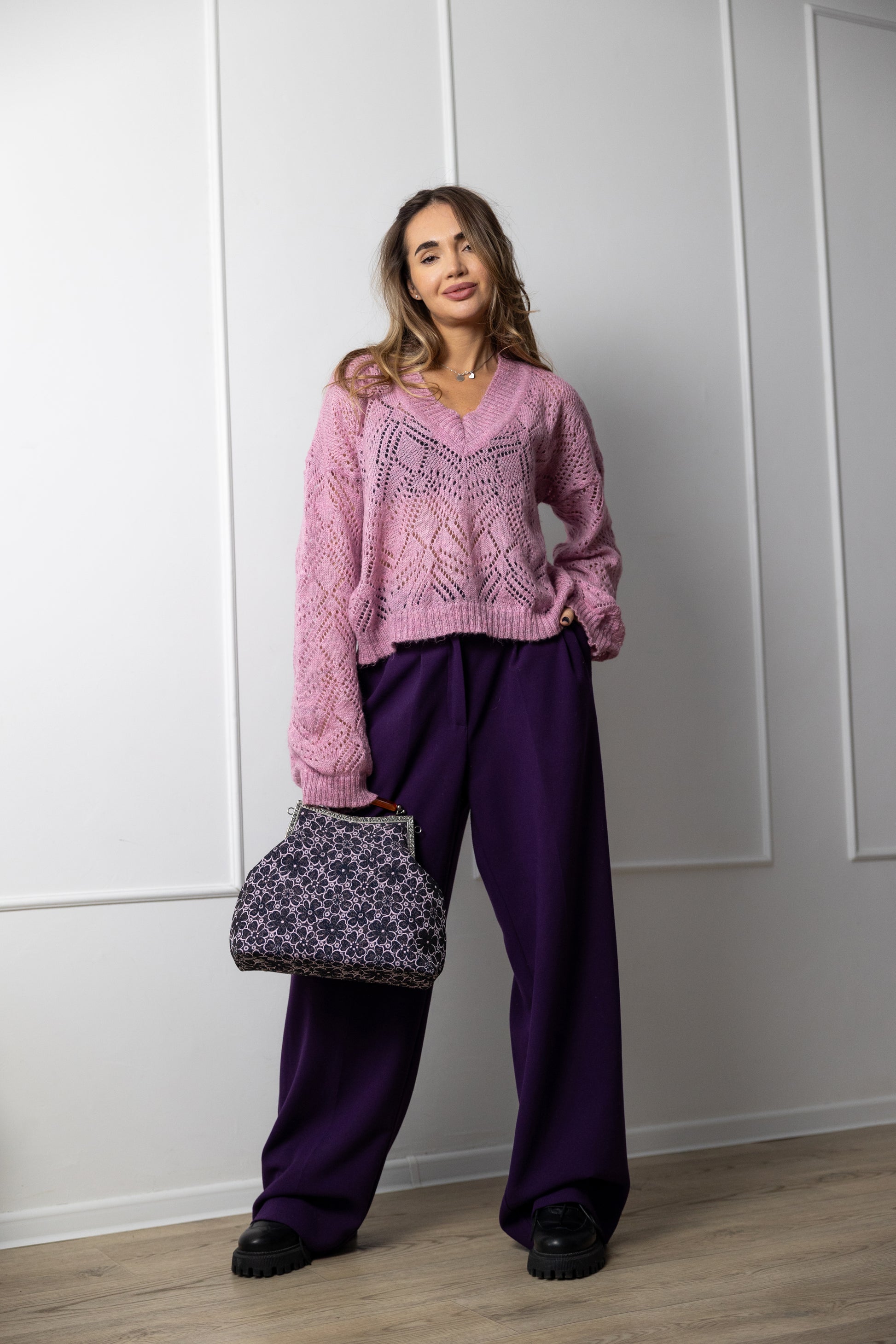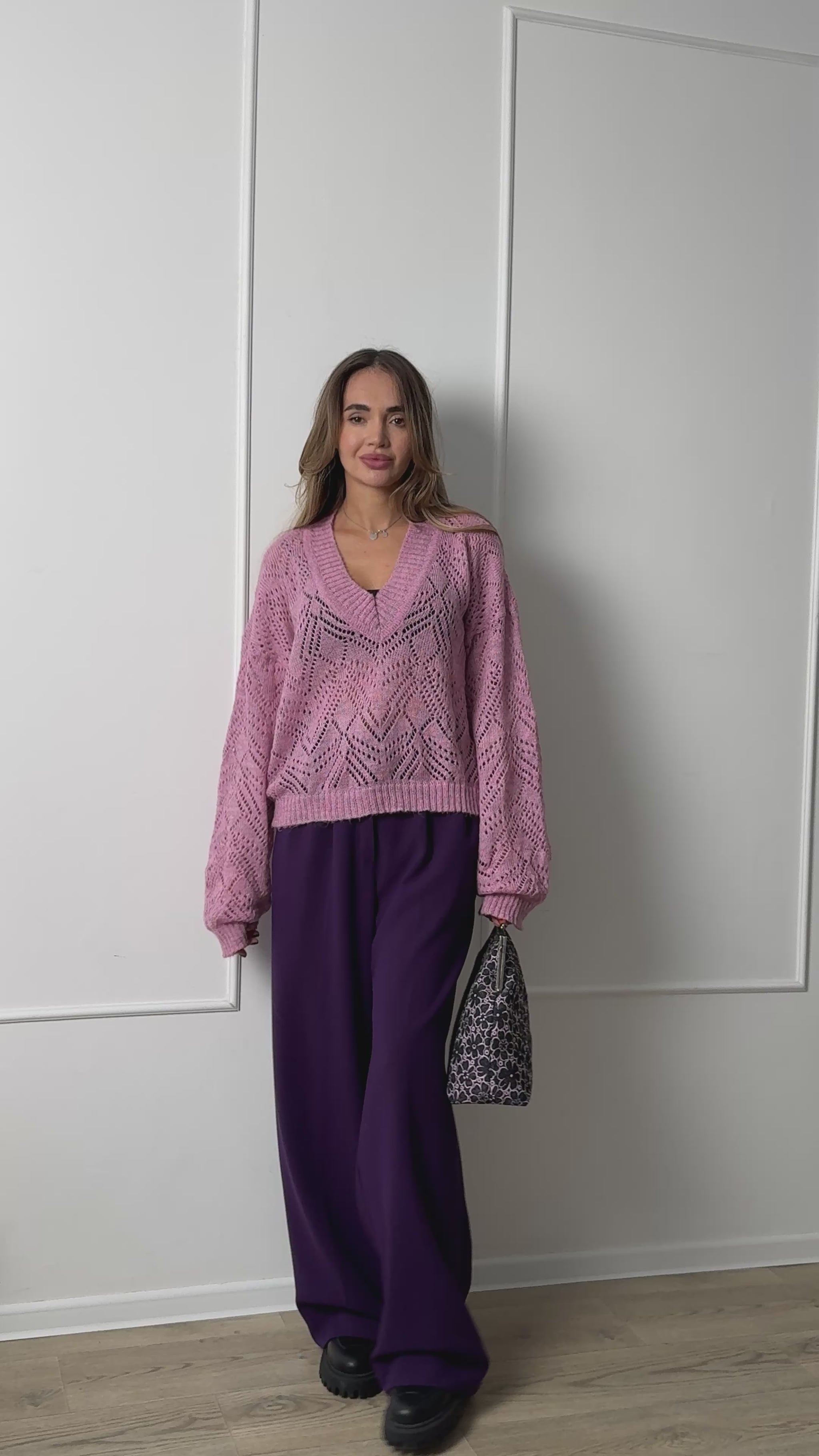 This fluffy oversized jumper is made entirely by hand with care and attention to every stitch. Despite its relaxed silhouette, it looks refined, feminine and modern. The deep V-neckline adds softness and elegance, making it easy to style for both casual and elevated outfits.