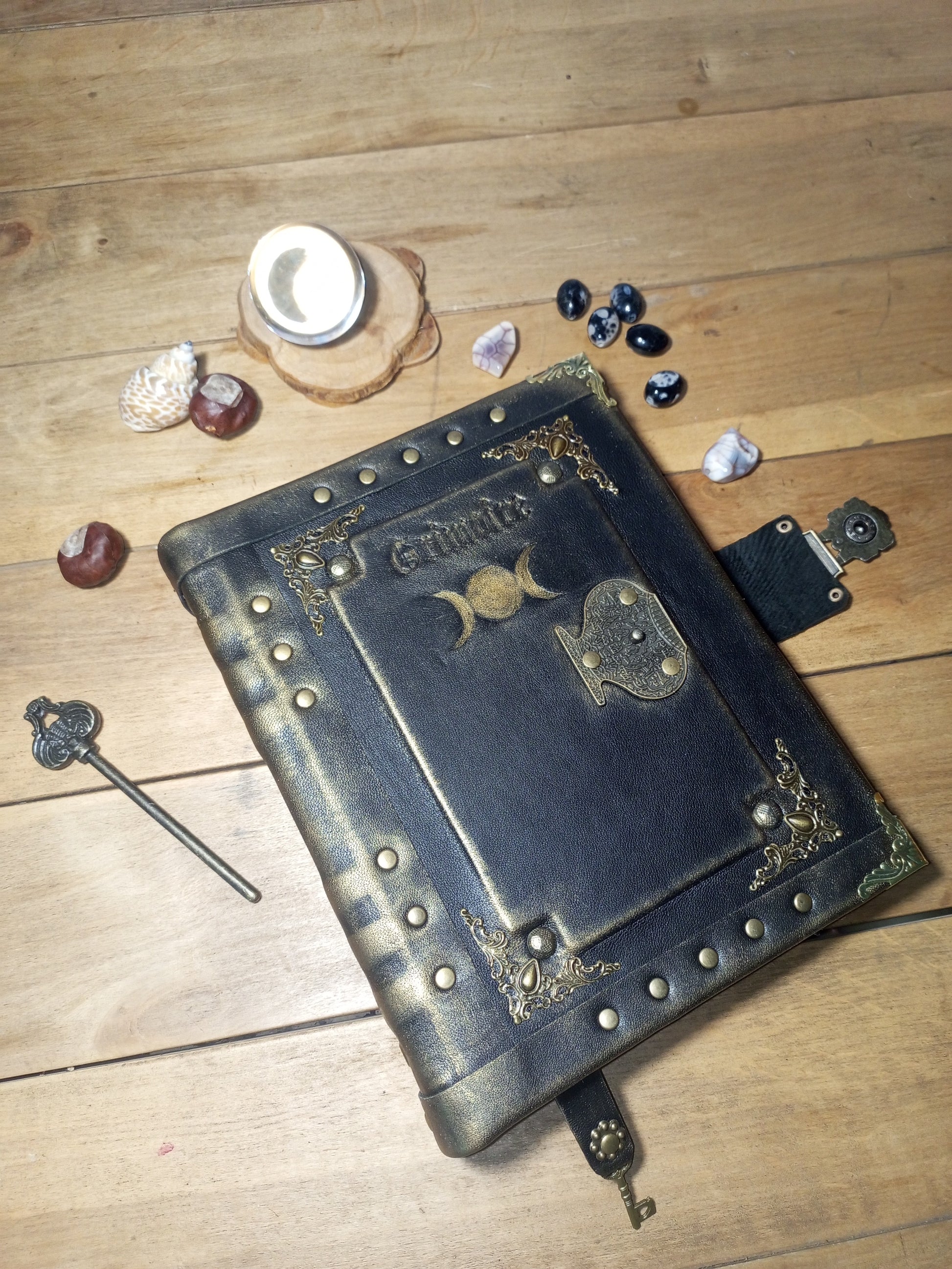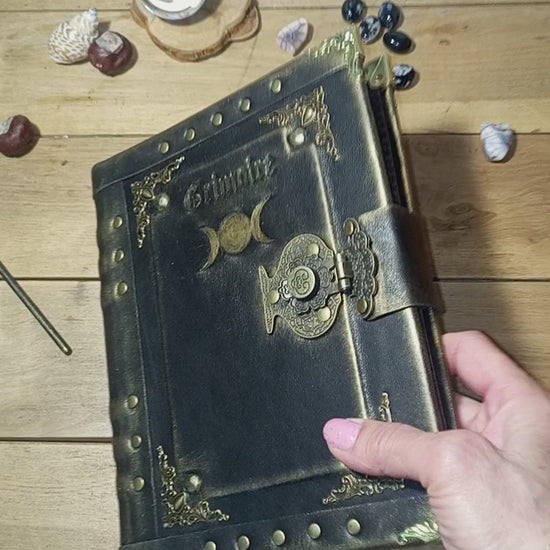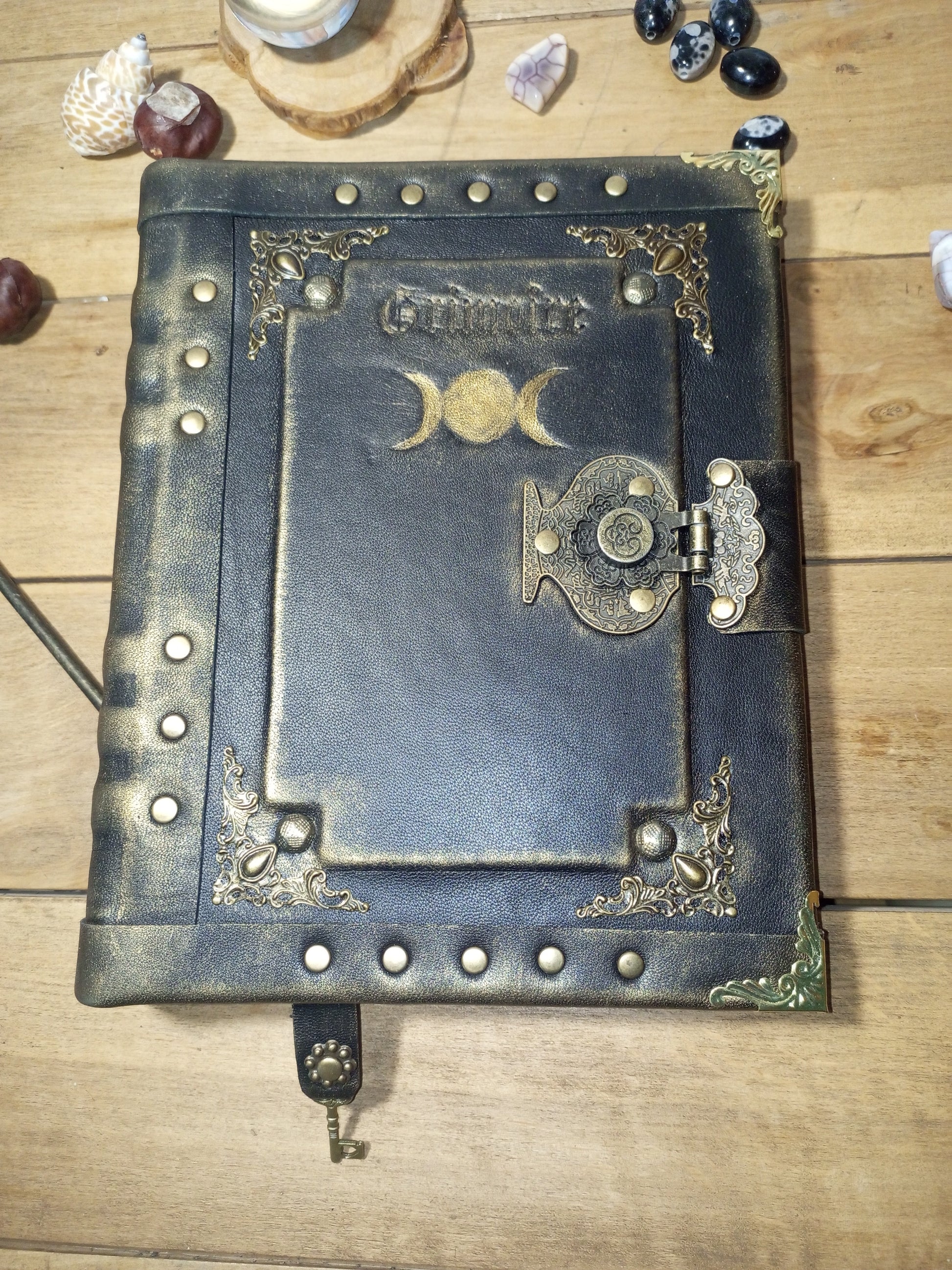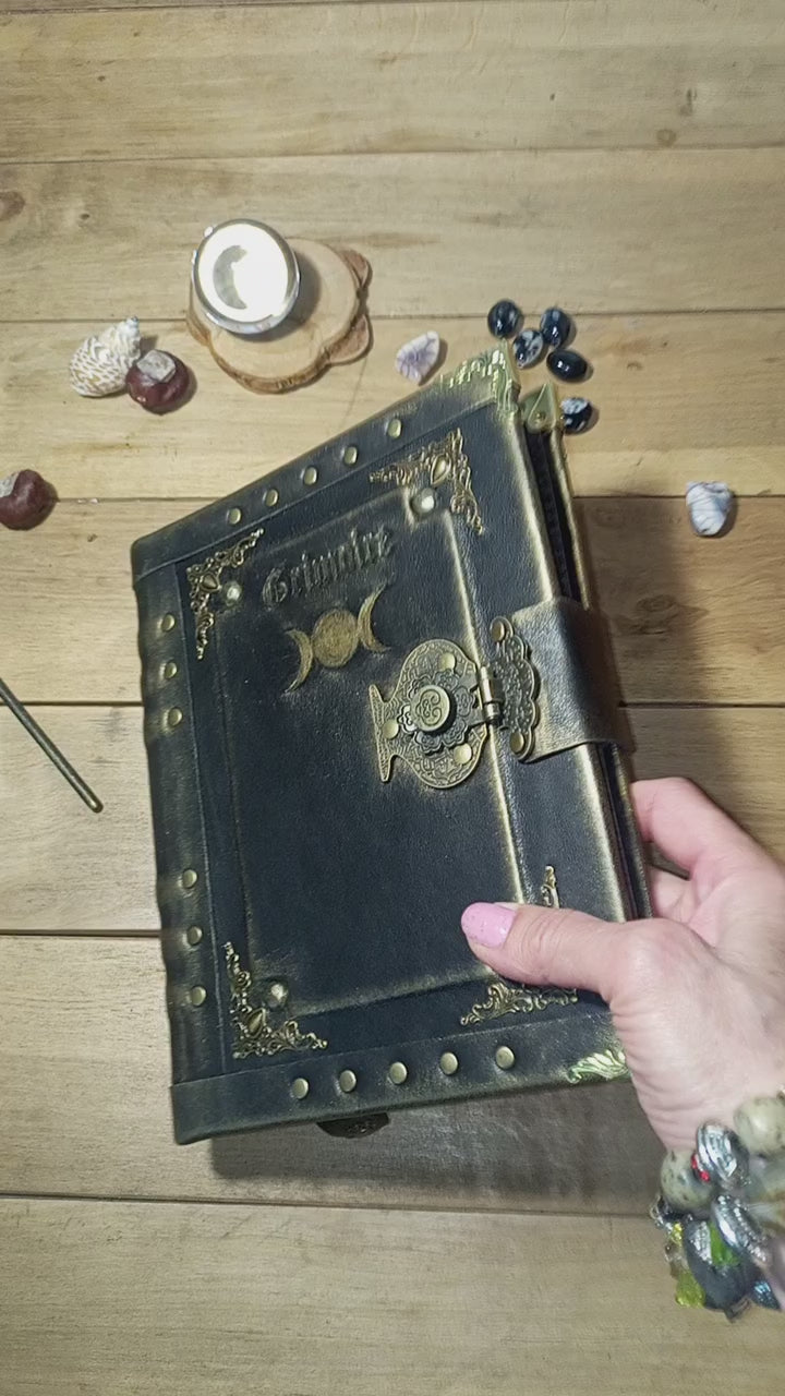Made from genuine natural leather and decorated with a celestial triple moon symbol, this journal has a rich and mystical allure. The design is enhanced by metal elements and a secure antique lock, giving it a timeless antique look and a powerful spiritual presence.