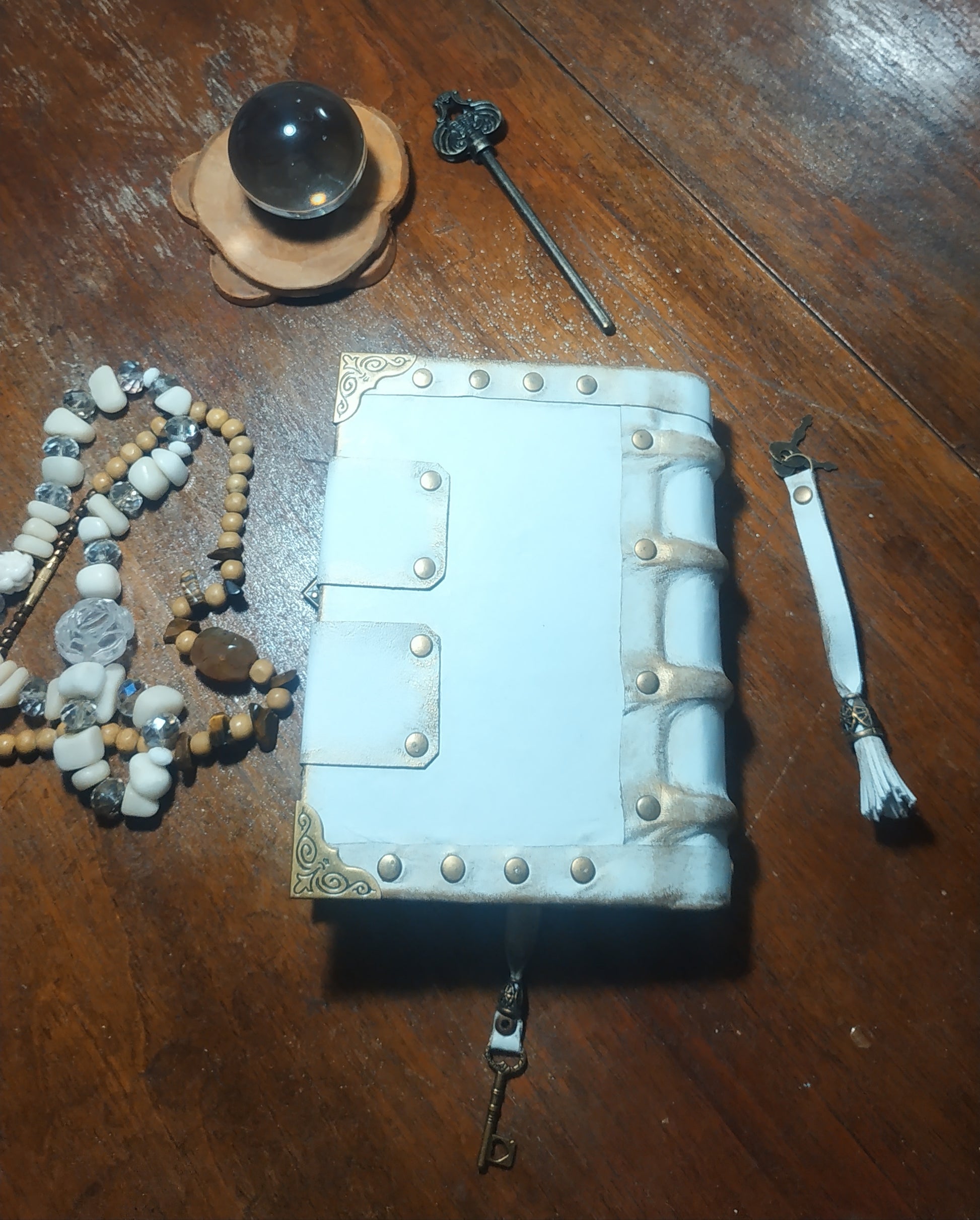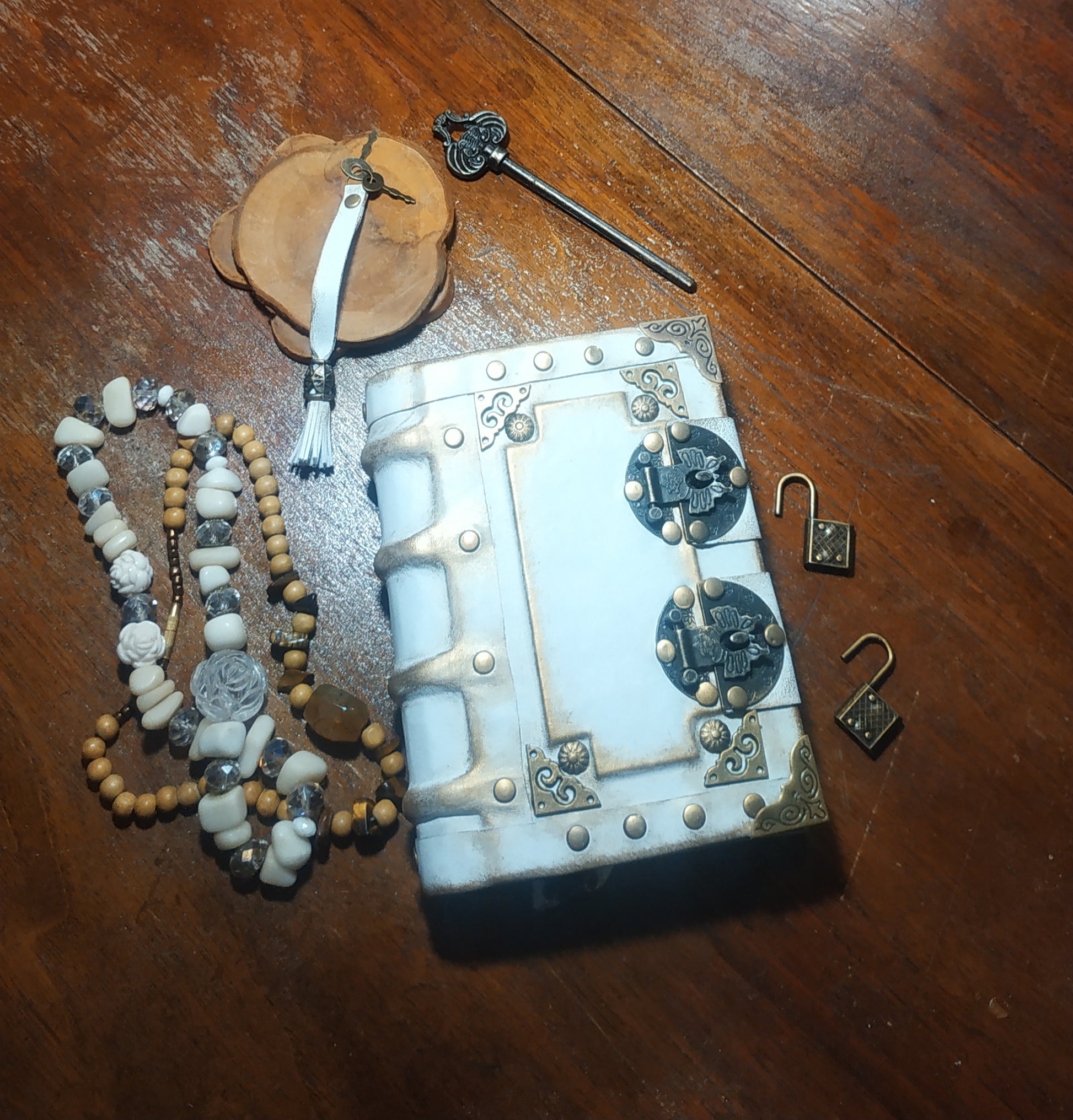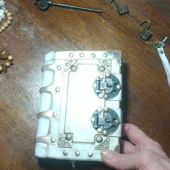 White Aged Leather Journal with Antique Locks – Medieval Wicca Grimoire Handmade Blank Vintage Notebook, 200 Pages