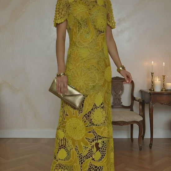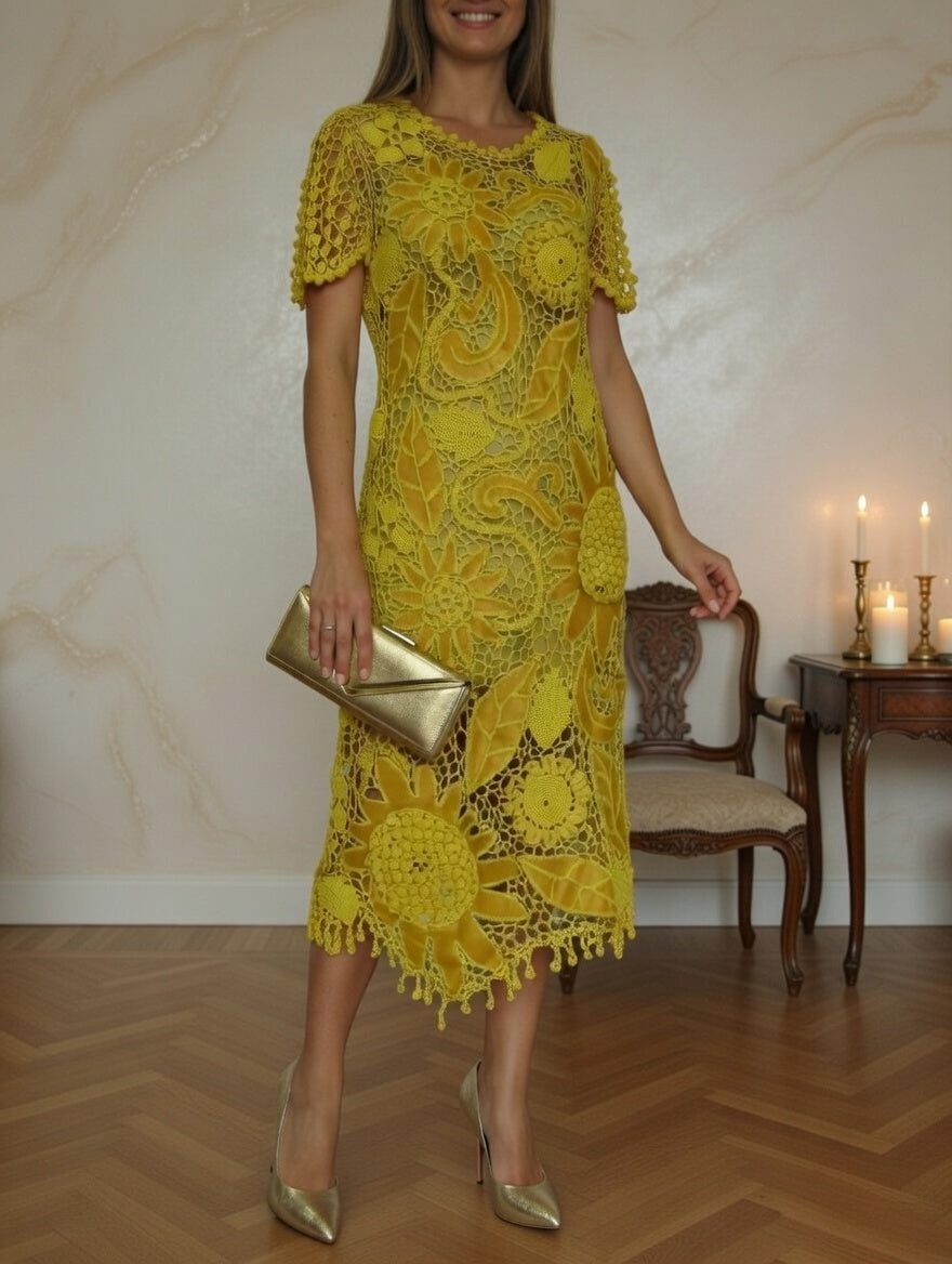 This yellow Irish lace crochet dress is a luxurious handmade design combining delicate lacework and genuine leather elements.